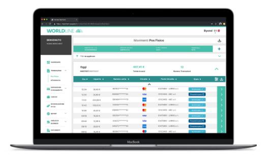 Accedendo al portale Byond di Worldline è possibile visualizzare sia l’estratto conto (nella sezione documenti) che l’elenco delle transazioni mensili, trimestrali e annuali (nella sezione transazioni Pos Fisco/Virtuale), selezionando il periodo di riferimento dal menu disponibile.