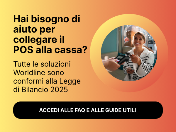 Offerta valida fino al 31/12/2026 dedicata ai nuovi clienti e attuali che effettueranno il convenzionamento da sito web. Per proseguire con il convenzionamento il cliente dovrà sottoscrivere il contratto di acquiring e di comodato d’uso. Per le condizioni economiche e contrattuali consultare il foglio informativo disponibile su www.worldlineitalia.it alla sezione Trasparenza. Il fornitore del servizio di acquiring è Worldline. La vendita dei prodotti e dei servizi presentati è soggetta all’approvazione di Worldline.