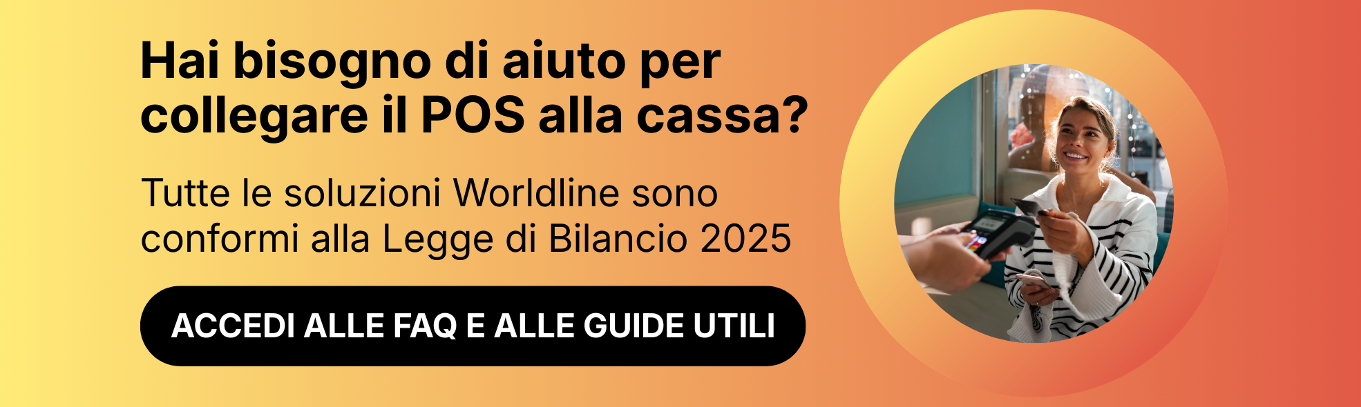 Il presente materiale ha natura pubblicitaria e viene diffuso con finalità promozionali. Per le condizioni economiche e contrattuali, consultare il foglio informativo disponibile su www.worldlineitalia.it alla sezione Trasparenza. Il fornitore del servizio di acquiring è Worldline. La vendita dei prodotti e dei servizi presentati è soggetta all’approvazione di Worldline. Offerta valida fino al 31/12/2026. Offerta riservata ai nuovi clienti.