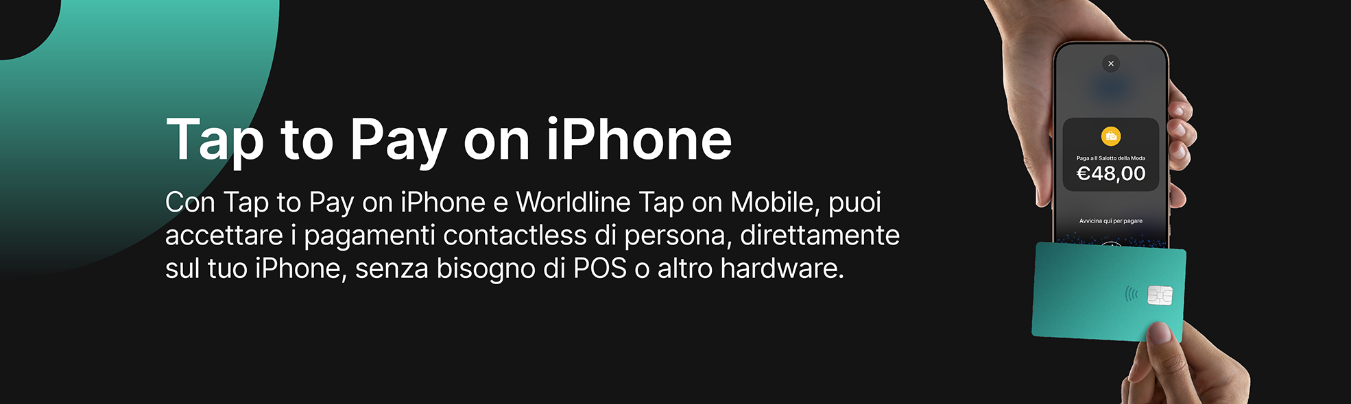 Con Tap to Pay on iPhone e Tap on Mobile di Worldline, puoi accettare pagamenti contactless direttamente sul tuo iPhone, dalle carte Mastercard, Visa ad Apple Pay e altri wallet digitali, senza bisogno di lettori o altro hardware.